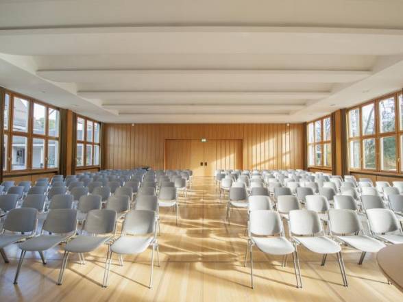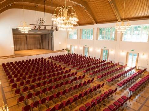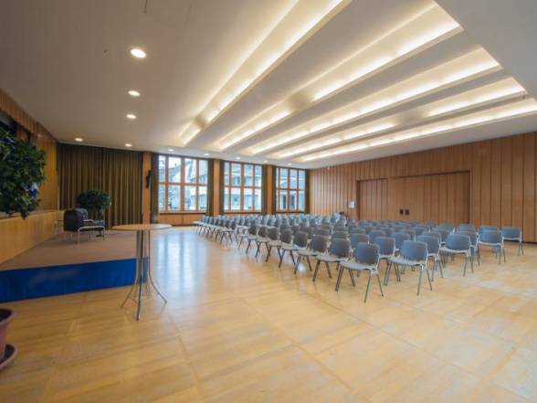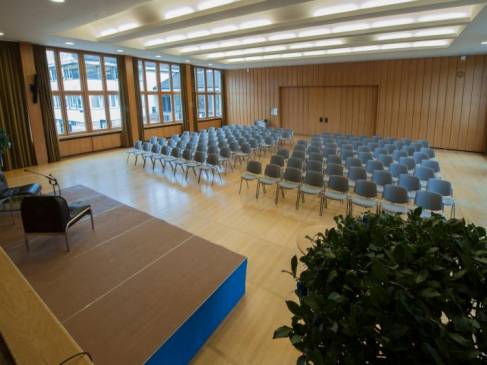 | Bürgersaal im Gemeindehaus Der Bürgersaal im Gemeindehaus an der Wettsteinstrasse 1 in Riehen ist ideal für Versammlungen und Bankette. Der Saal steht in erster Linie der Gemeinde Riehen zur Verfügung und kann von Vereinen und Institutionen für Anlässe wie Generalversammlungen, kleinere Theatervorführungen etc. genutzt werden. Hochzeiten, private Geburtstage etc. können jedoch nicht berücksichtigt werden. Der Saal verfügt über ausgezeichnete Akustik einer Hauptbühne oder einer mobilen Bühne. Film oder Bild-Präsentationen können mit Beamer gezeigt werden. Eine Mikrofonanlage mit diversen Installationsmöglichkeiten ist ebenfalls vorhanden. Das Foyer verfügt über eine Küchenkombination mit zwei Kühlschränken sowie einen Industrie-Geschirrspüler. Somit lässt sich ein Apéro oder ein Catering-Anlass mit Nachtessen ebenfalls sehr gut durchführen. Zudem hat es noch einen grossen Empfangsbereich, die Eingangshalle zur Verwaltung und zum Saal respektive Foyer Trakt hin. Die Räumlichkeiten lassen sich durch zwei beliebig verstellbare Schiebeelemente öffnen. Somit ergibt sich ein großartiges Gesamtbild durch alle Räumlichkeiten. Grösse: ca. 300 m 2 Rahmenbedingungen
